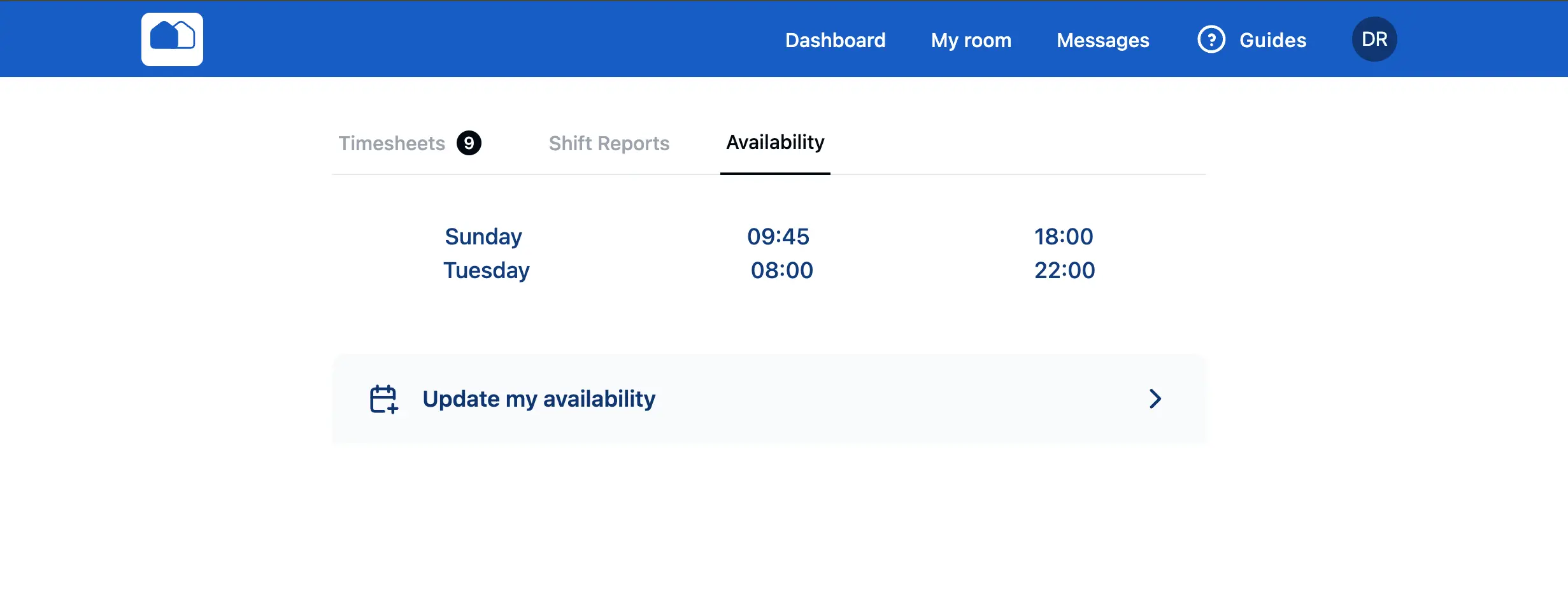 The availability dashboard for management users is where they can create and manage their availability schedule. Availability schedules are used to define the hours of operation that each managerment user is available for when doing a duty roster for the residence.